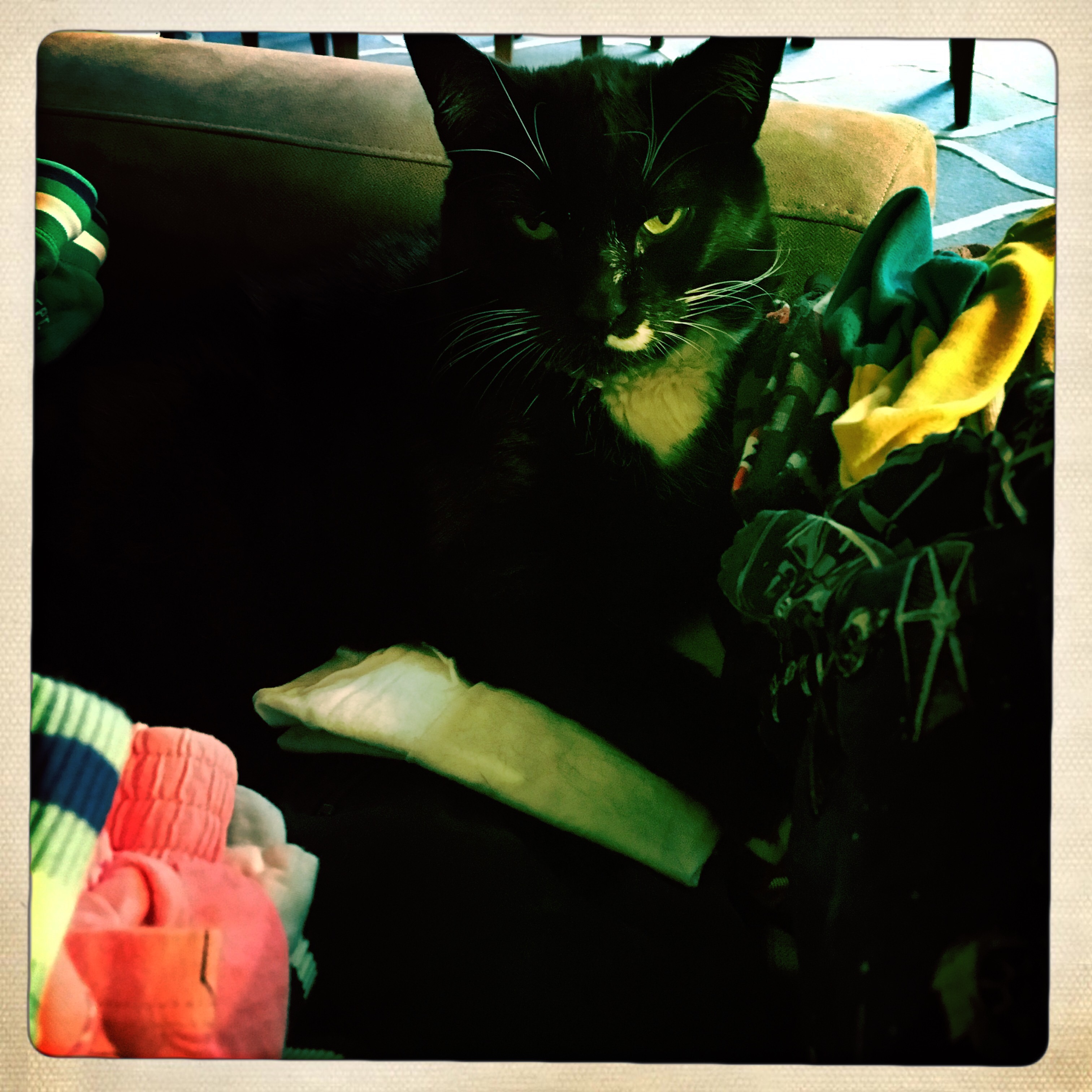 The guy featured above is Freddy, and he’s clearly half-lidded and stoned on clean laundry fumes. Please note that he has chosen the white article of clothing as his base. He’s got a knack for that. Freddy came to live with us about two months ago and has never looked back. He’s eighteen pounds of pure wanting more, and this house is equipped with a small, blonde, roving treat-dispenser. When she’s not around, or when guests come, or, let’s be honest, any time that the little hand is moving on the clock, Freddy can be found in front of his food cabinet pleading his case. For hours. It’s become like living near a train – I don’t even hear his whistle anymore.
